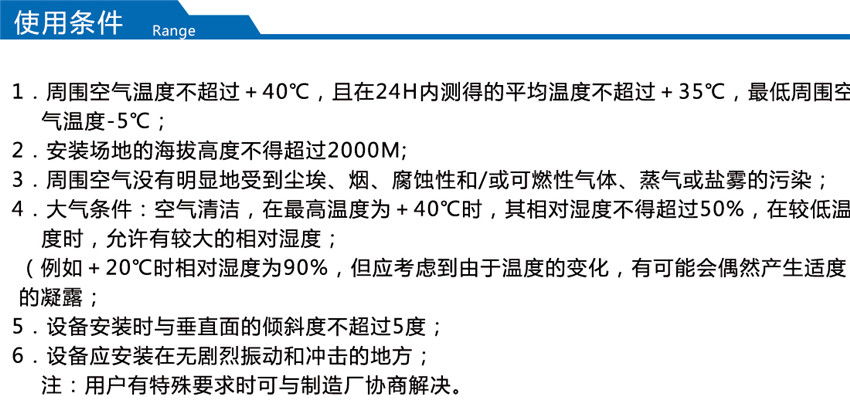 2. 大氣條件:空氣清潔,相對濕度在最高溫度+40℃時(shí)不超過50﹪;在較低溫度時(shí)允許有較高的相對濕度,例如20℃時(shí)為90﹪,但應(yīng)考慮到由于溫度的變化,有可能會偶然地產(chǎn)生適度的凝露。