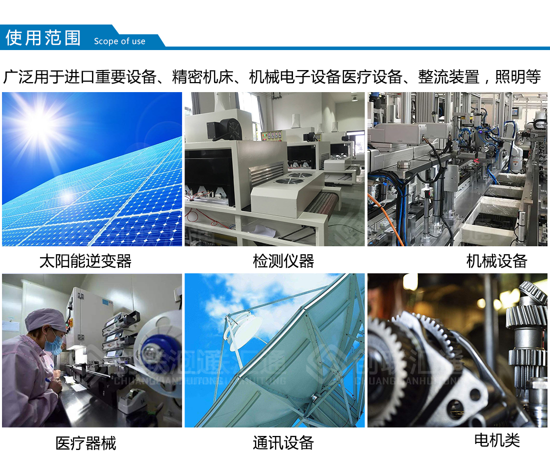 廣泛用于進(jìn)口重要設(shè)備、機(jī)密機(jī)床、機(jī)械電子設(shè)備、醫(yī)療設(shè)備、整流裝置、照明等,安裝場(chǎng)所應(yīng)無(wú)嚴(yán)重影響變壓器絕緣強(qiáng)度的氣體,蒸汽,化學(xué)性沉積,污垢,導(dǎo)電塵埃及無(wú)其他易爆易燃易腐蝕的物質(zhì)。
