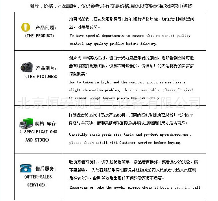 1.我公司對(duì)生產(chǎn)的全部產(chǎn)品實(shí)行“三包”,保證產(chǎn)品采用較佳材料和一流工藝,符合合同規(guī)定的質(zhì)量﹑規(guī)定和性能要求。保證其合同設(shè)備經(jīng)過正確安裝﹑合理操作和維護(hù)保養(yǎng),在合同設(shè)備使用期內(nèi)運(yùn)轉(zhuǎn)良好,在規(guī)定的質(zhì)量保證期內(nèi),對(duì)由于設(shè)計(jì)工藝或材料的缺陷而造成的故障負(fù)責(zé),免費(fèi)負(fù)責(zé)修理或更換有缺陷的電器元件。