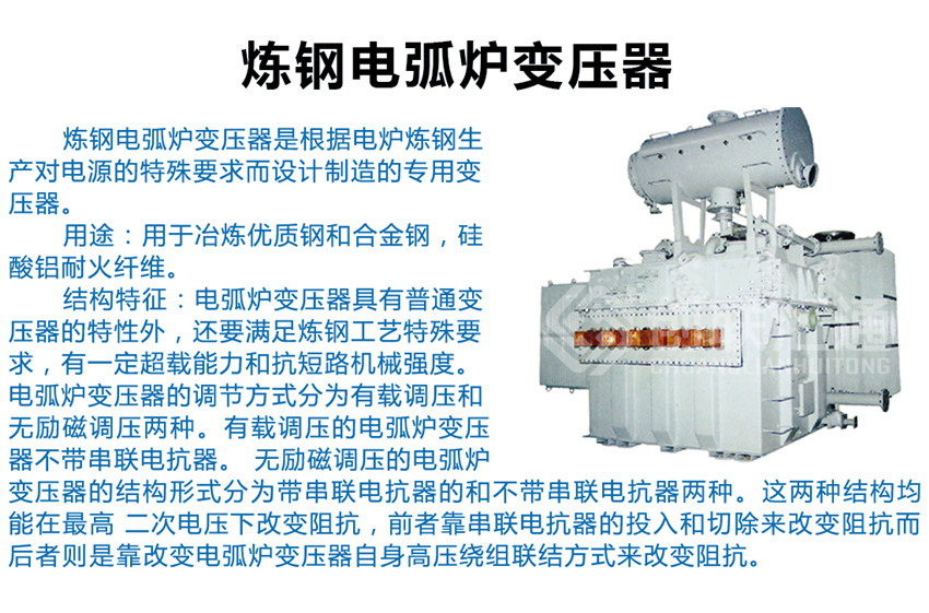 電弧爐變壓器具有普通變壓器的特性外,還要滿足煉鋼工藝特殊要求,有一定超載能力和抗短路機械強度。電弧爐變壓器的調(diào)節(jié)方式分為有載調(diào)壓和無勵磁調(diào)壓兩種。有載調(diào)壓的電弧爐變壓器不帶串聯(lián)電抗器。 無勵磁調(diào)壓的電弧爐變壓器的結(jié)構(gòu)形式分為帶串聯(lián)電抗器的和不帶串聯(lián)電抗器兩種。這兩種結(jié)構(gòu)均能在高 二次電壓下改變阻抗,前者靠串聯(lián)電抗器的投入和切除來改變阻抗,而后者則是靠改變電弧爐變壓器自身高 壓繞組聯(lián)結(jié)方式來改變阻抗。