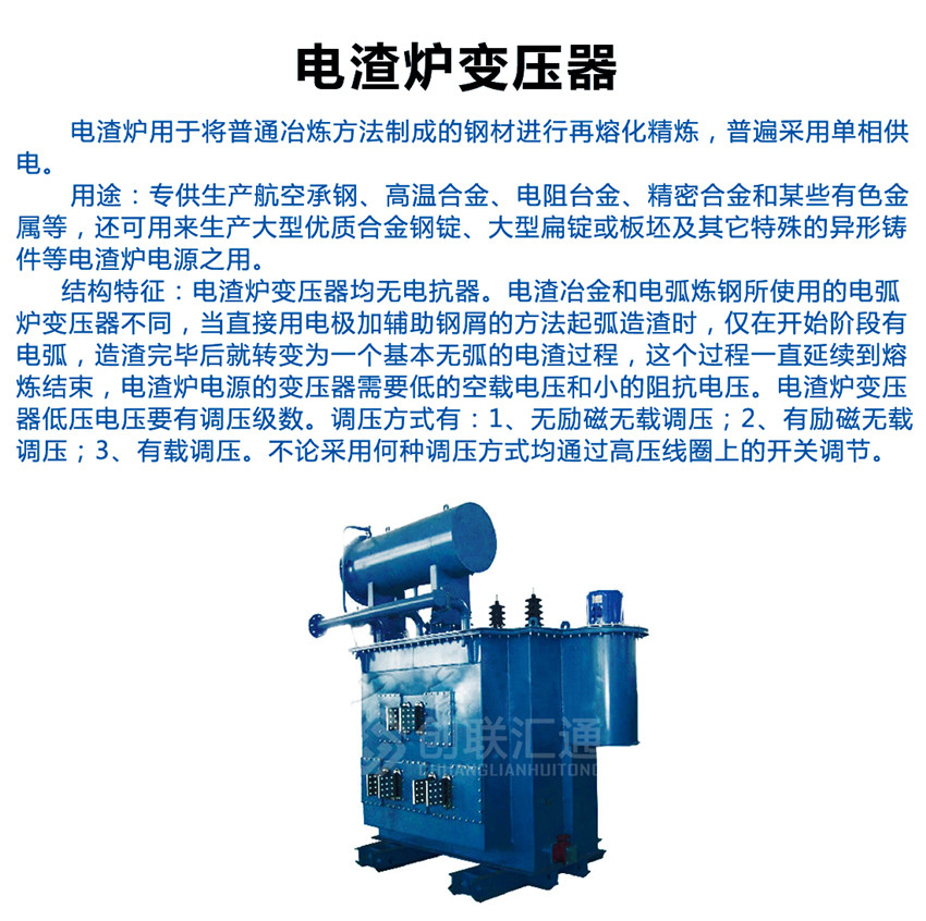 電渣爐變壓器電渣爐變壓器均無(wú)電抗器,專(zhuān)供生產(chǎn)航空承鋼、高溫合金、電阻臺(tái)金、精密合金和某些有色金屬等,還可用來(lái)生產(chǎn)大型優(yōu)質(zhì)合金鋼錠、大型扁錠或板坯及其它特殊的異形鑄件等電渣爐電源之用。