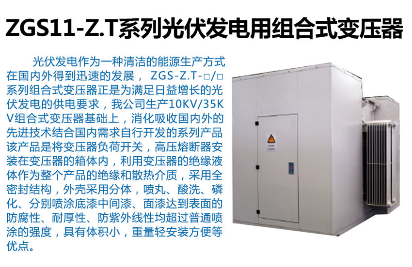 ZGS-Z.T-□/□系列組合式變壓器是消化吸收內(nèi)外的先進(jìn)技術(shù)結(jié)合內(nèi)需求自行開發(fā)的系列產(chǎn)品,該產(chǎn)品是將變壓器,負(fù)荷開關(guān),高壓熔斷器安裝在變壓器的箱體內(nèi),利用變壓器的絕緣液體作為整個產(chǎn)品的絕緣和散熱介質(zhì),采用全密封結(jié)構(gòu),外殼采用分體,噴丸、酸洗、磷化、分別噴涂底漆、中間漆、面漆達(dá)到表面的防腐性、耐厚性、防紫外線性均超過普通噴涂的強(qiáng)度,具有體積小,重量輕、安裝方便等優(yōu)點。
