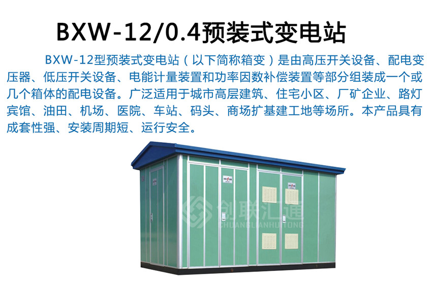 BXW-12型預裝式變電站(以下簡稱箱變)是由高壓開關(guān)設(shè)備、配電變壓器、低壓開關(guān)設(shè)備、電能計量裝置和功率因數(shù)補償裝置等部分組裝成一個或幾個箱體的配電設(shè)備。廣泛適用于城市高層建筑、住宅小區(qū)、廠礦企業(yè)、路燈、賓館、油田、機場、醫(yī)院、車站、碼頭、商場擴基建工地等場所。本產(chǎn)品具有成套性強、安裝周期短、運行安全